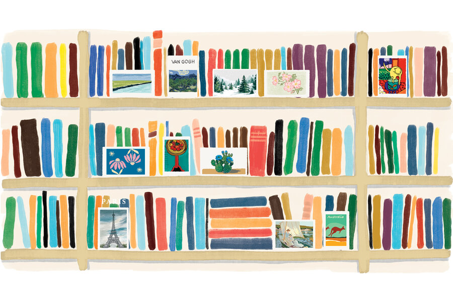 Once we returned home, though, I could see that the improvised art exhibit in my home office was getting cluttered. I felt greedy hoarding all those visual treasures, and I was beginning to understand that postcards don’t really reach their promise unless they’re sent to someone else. Those beautifully colored miniatures – a snowy woodscape, a pink dog rose, an impressionist painting of two women on a sailboat – now struck me as oddly constrained in my bookcase, like tropical birds confined to a cage.