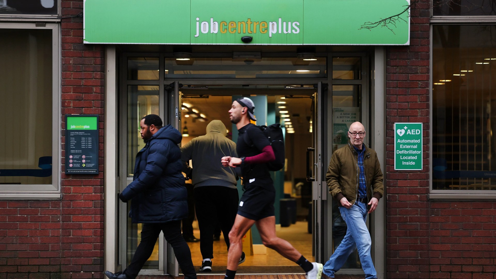 Pedestrians walk past a Jobcentre Plus in London, Britain.