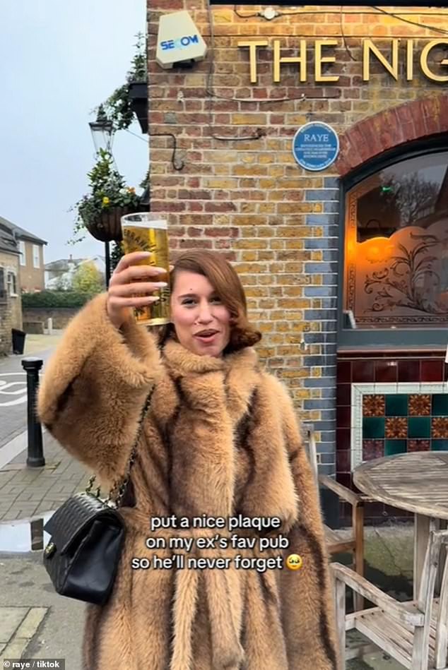The video shows the laughing star, clad in a fur coat and carrying a Chanel bag, clutching a pint of beer as she points out the sign, with the caption reading: ‘put a nice plaque on my ex’s fav pub so he’ll never forget.’
