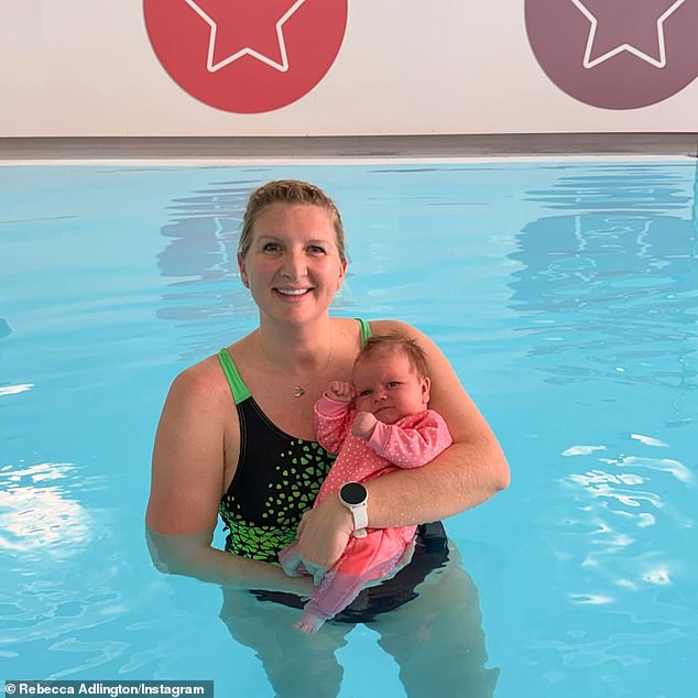 Rebecca Adlington was all smiles in sweet Instagram photos as she took her newborn daughter Thea Joy swimming for the first time on Friday.