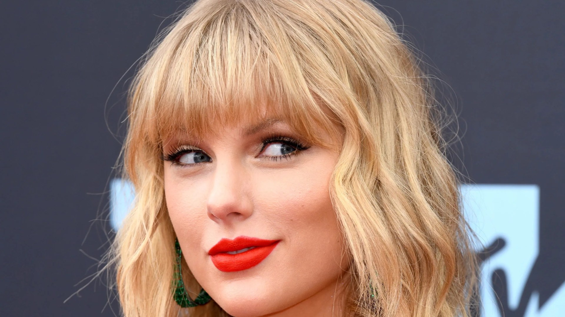 Taylor Swift in a colorful patterned jacket and pink top, looking to the side.