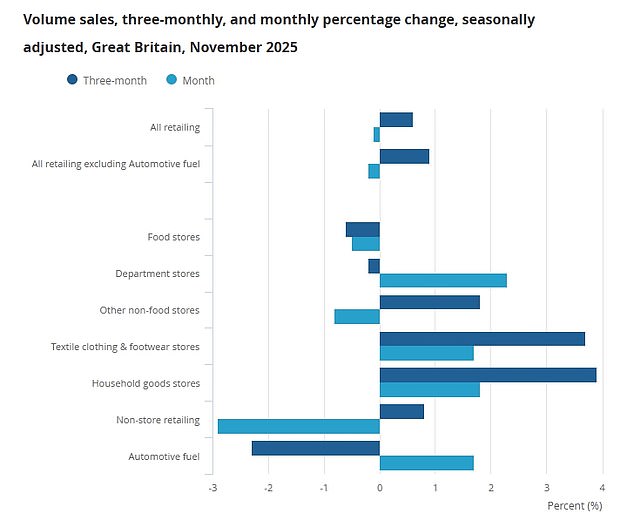 ONS senior statistician Hannah Finselbach said: ‘Retail continued to grow in the three months to November, helped by a strong performance from clothing and tech shops.