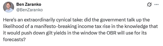 Ben Zaranko, an economist with the IFS think-tank, said: ‘Here’s an extraordinarily cynical take: did the government talk up the likelihood of a manifesto-breaking income tax rise in the knowledge that it would push down gilt yields in the window the OBR will use for its forecasts?’