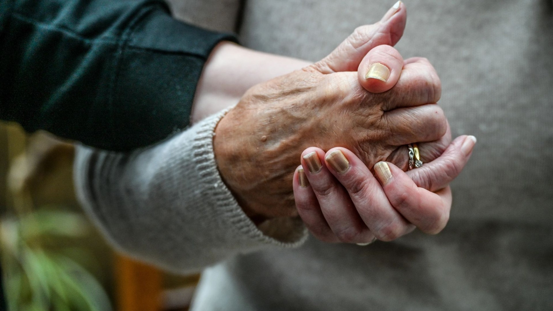 A young hand placed on top of an elderly person's hand, who is wearing a ring.