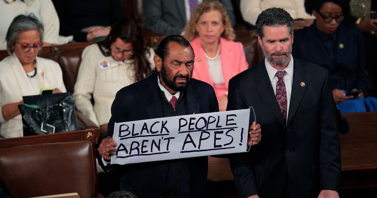 Attempting to recapture his magic of last year, Rep. Al Green walks out of the SOTU address carrying a banner reading “Black People Aren’t Apes.”