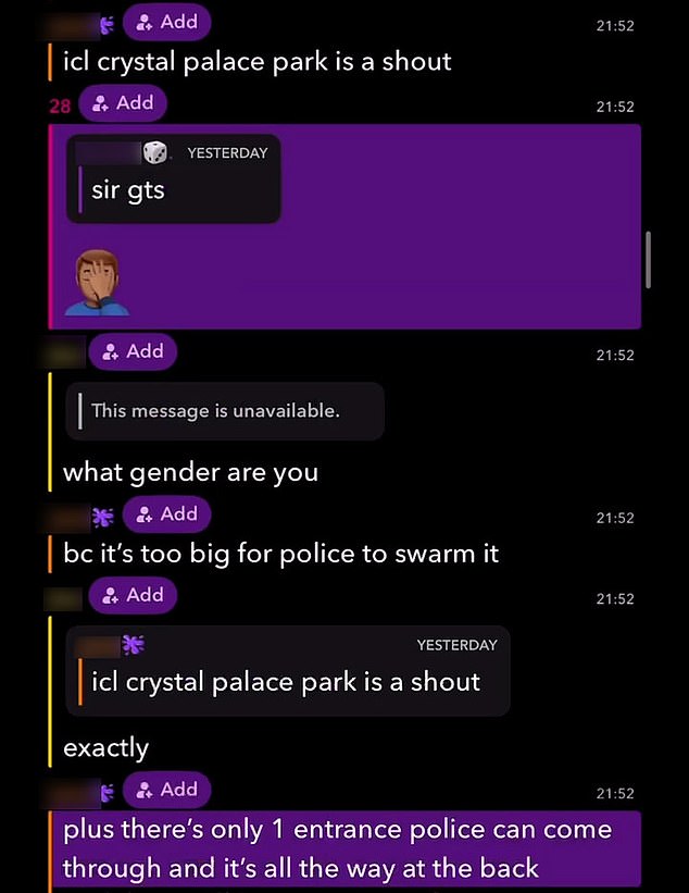 ‘Crystal Palace Park is a shout,’ one person says. ‘Bc [Because] it’s too big for police to swarm it, plus there’s only one entrance police can come through and it’s all the way at the back.’