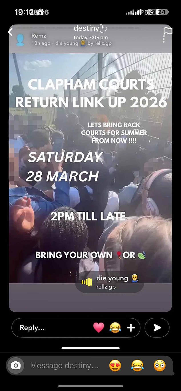 Frenzied ‘link ups’ over the past few days were first arranged using a digital flyer on Snapchat which read: ‘Clapham Courts return link up 2026…Let’s bring back courts for summer from now!!!! Saturday 28 March – 2pm till late.’