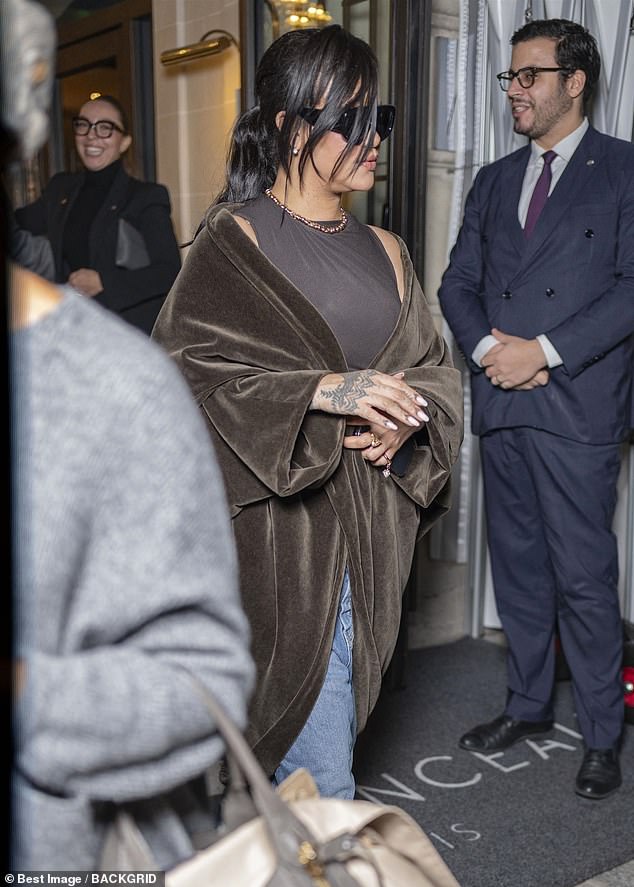 Legendary singer Rihanna, 37, rocked a brown coat and denim jeans completed her look with a pair of oversized shades as she was seen outside the Le Royal Monceau.