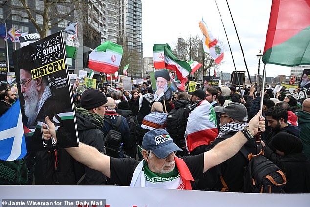 Pro-Iran demonstrators unfurl huge Palestinian flags brandished with the words ‘boycott the Zionist’ and ‘Be on the right side of history’