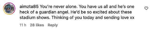 ‘You’re never alone. You have us all and he’s one heck of a guardian angel. He’d be so excited about these stadium shows. Thinking of you today and sending love x’x