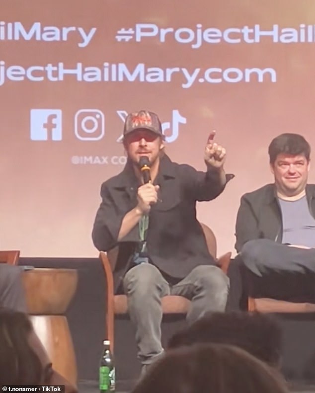 A TikToker captured a video of the La La Land star interrupting the moderator to call on his brother-in-law to stand up, saying: ‘Can I stop you one second? Carlos are you in the audience? Can you stand up for a second.’