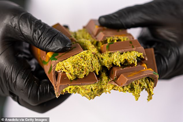 The viral bar is inspired by a Middle Eastern dessert called Knafeh and are filled with pistachio cream, tahini and Kataifi pastry – a pastry made from shredded filo dough.