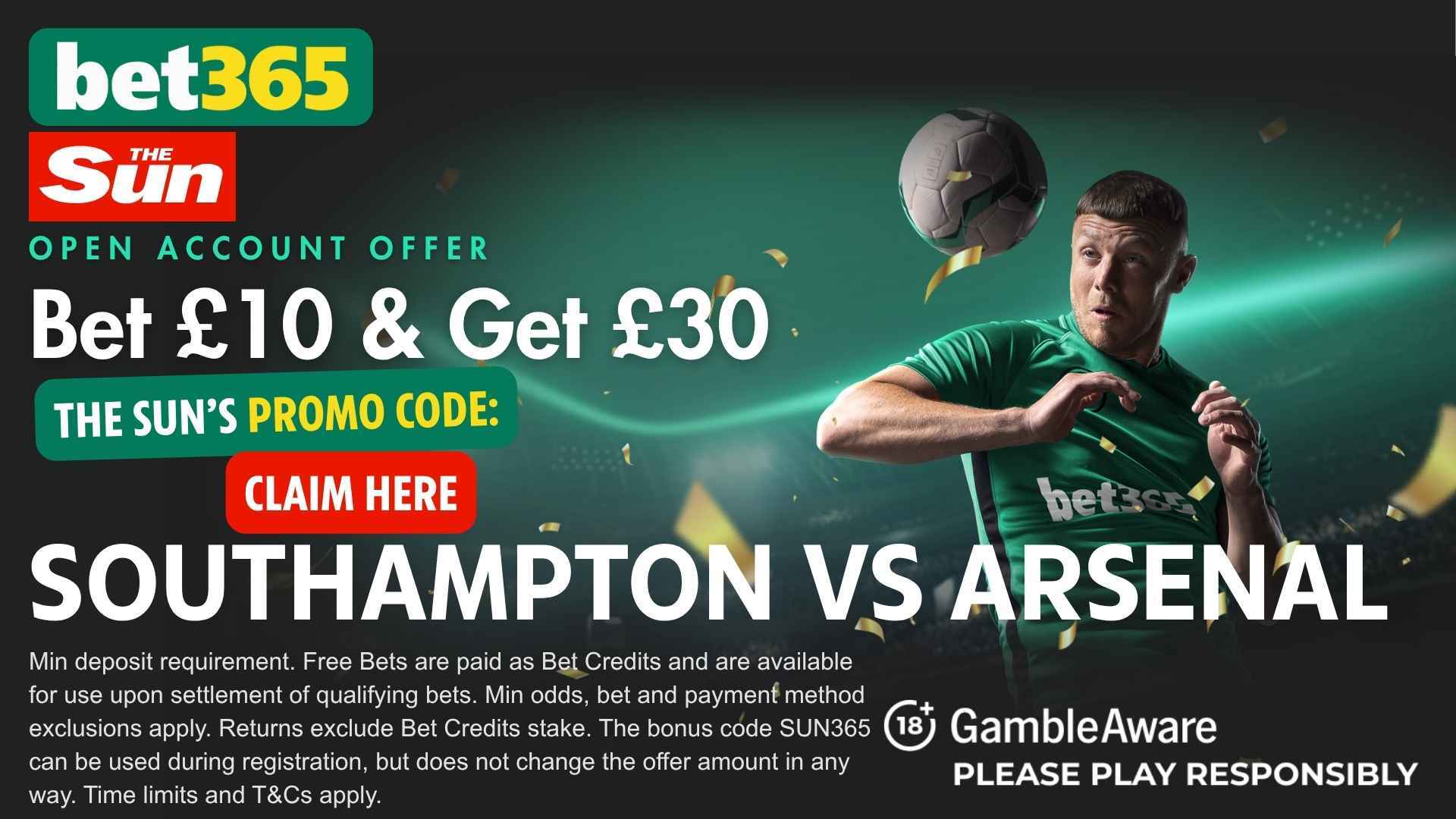 You can back the Saints to stun the Premier League leaders – or the Gunners to punch another Wembley ticket – by claiming a 300% welcome offer using the bet365 bonus code SUN365.