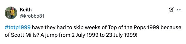 ‘Have they had to skip weeks of Top of the Pops 1999 because of Scott Mills? A jump from 2 July 1999 to 23 July 1999!’: ‘wonder if some BBC intern is frantically deleting old Top of the Pops eps that Scott Mills hosted’: ‘Cant wait to not see the Scott Mills editions or top of the pops!’.