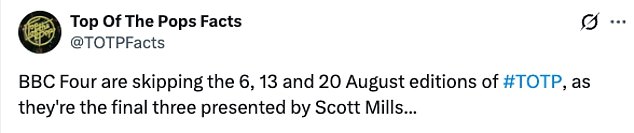 Taking to X they said: ‘BBC Four are skipping the 6, 13 and 20 August editions of #TOTP, as they’re the final three presented by Scott Mills…’: ‘
