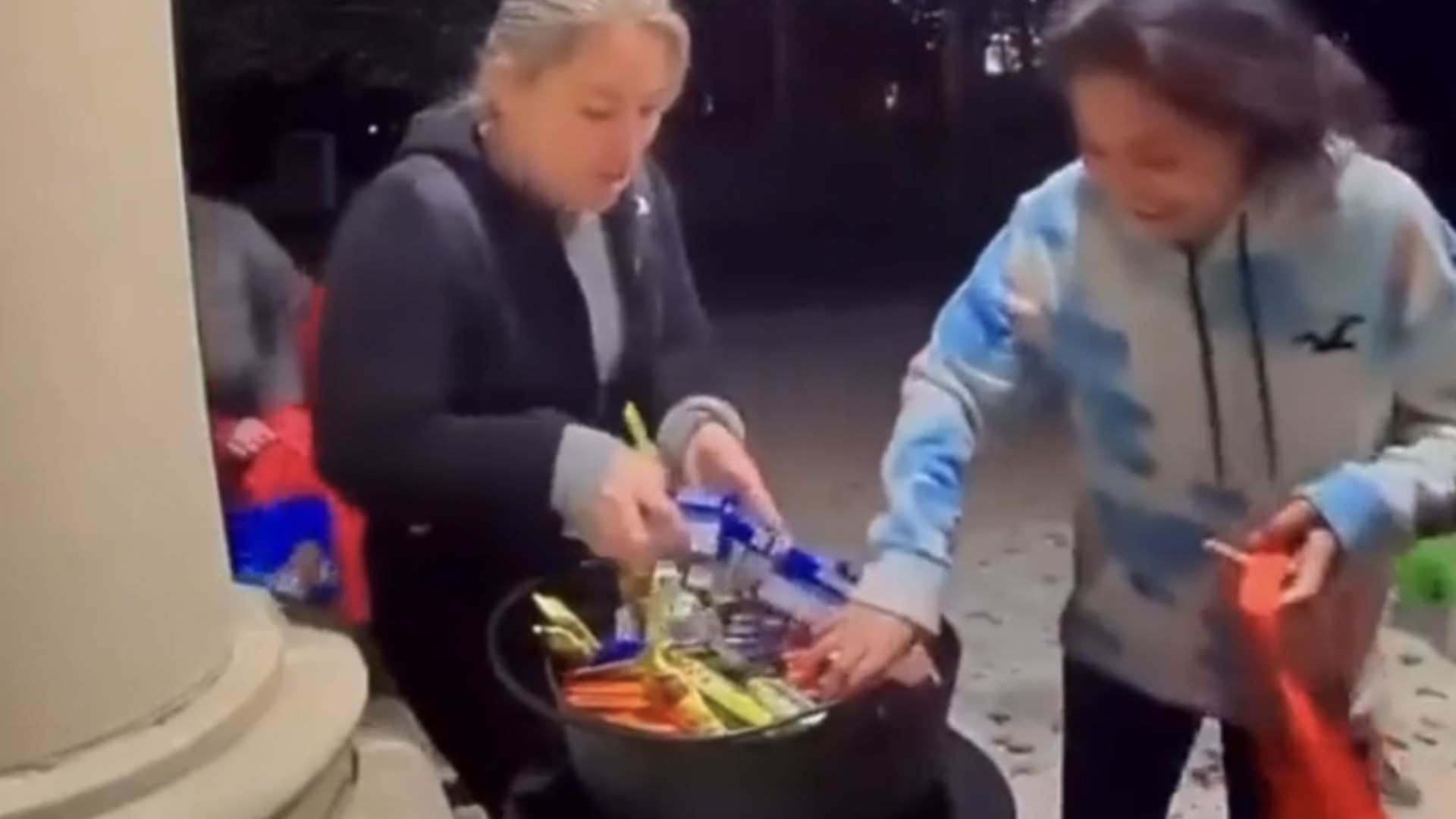 In a resurfaced video, taken on a Ring doorbell, a group of parents can be seen running up to a trick or treat bucket, and emptying all of the sweets and chocolates in to carrier bags.