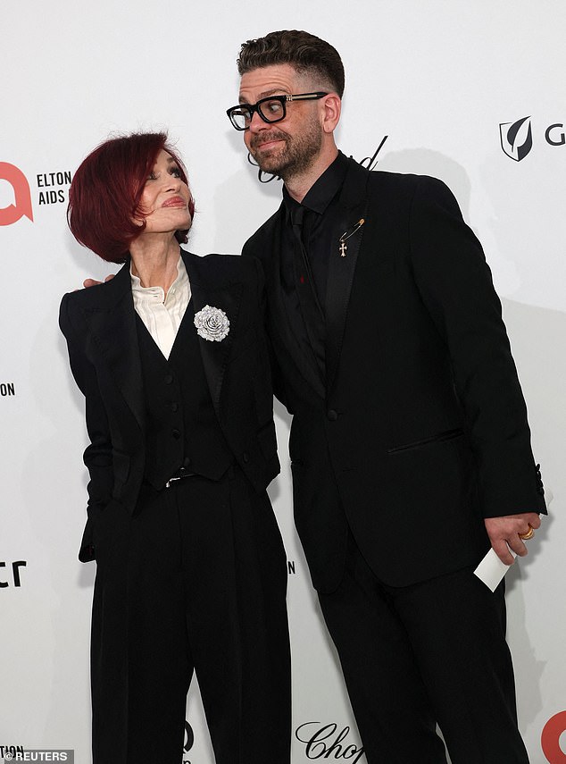 Sharon Osbourne looked in great spirits as she was joined by her son Jack at Elton John‘s Oscars viewing party on Sunday.