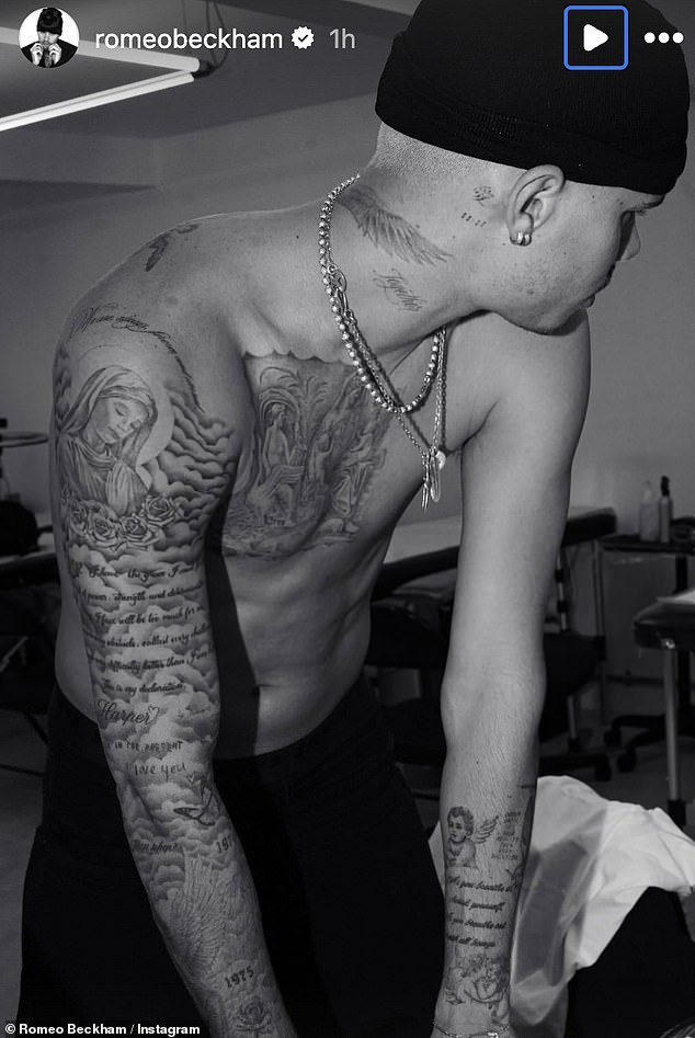 Romeo Beckham has shared a new photo showing off his extensive tattoo collection as he appears to steer clear of ongoing family drama involving his brother Brooklyn