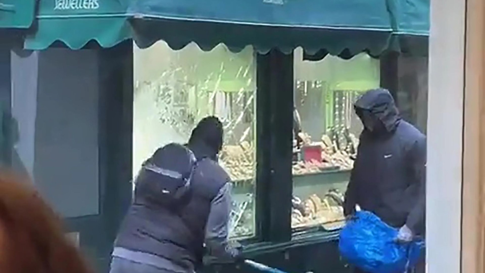They then start plundering the valuables on display and shoving them into a blue carrier bag.