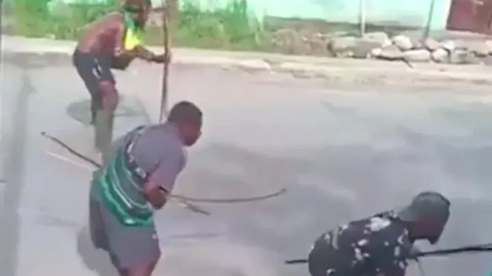 Dramatic footage shows dozens of men pouring onto a narrow roadway, hunched low as they advanced towards one another armed with bows, arrows and machetes.