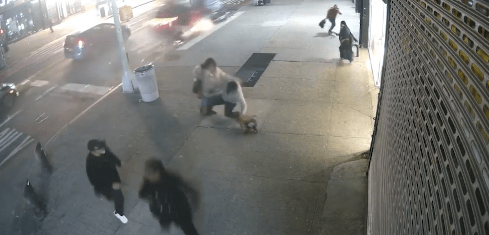 CCTV footage from the crash just after 8pm on Thursday shows pedestrians on West 125th Street and Frederick Douglass Boulevard diving for cover as the red car makes no effort to stop.