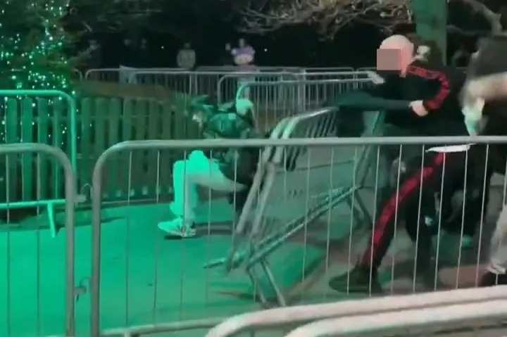 In the latest clip, screams can be heard as punches are thrown among the largely empty queuing area on Wednesday evening, as some of the metal barricades are knocked out of place.