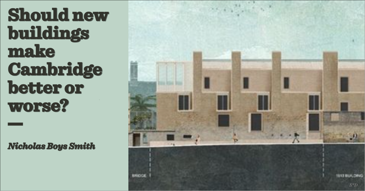 Should new buildings in Cambridge make the town better or worse? Should they be joyful or joyless, symbolic or meaningless? Does it matter if people like them or not? Should the planning system care? Does the “spirit of the place” matter more or the “spirit of the age”? Are we building for a self-regarding, isolated elite, ignorant of and contemptuous of public opinion, or for the passing man and woman?