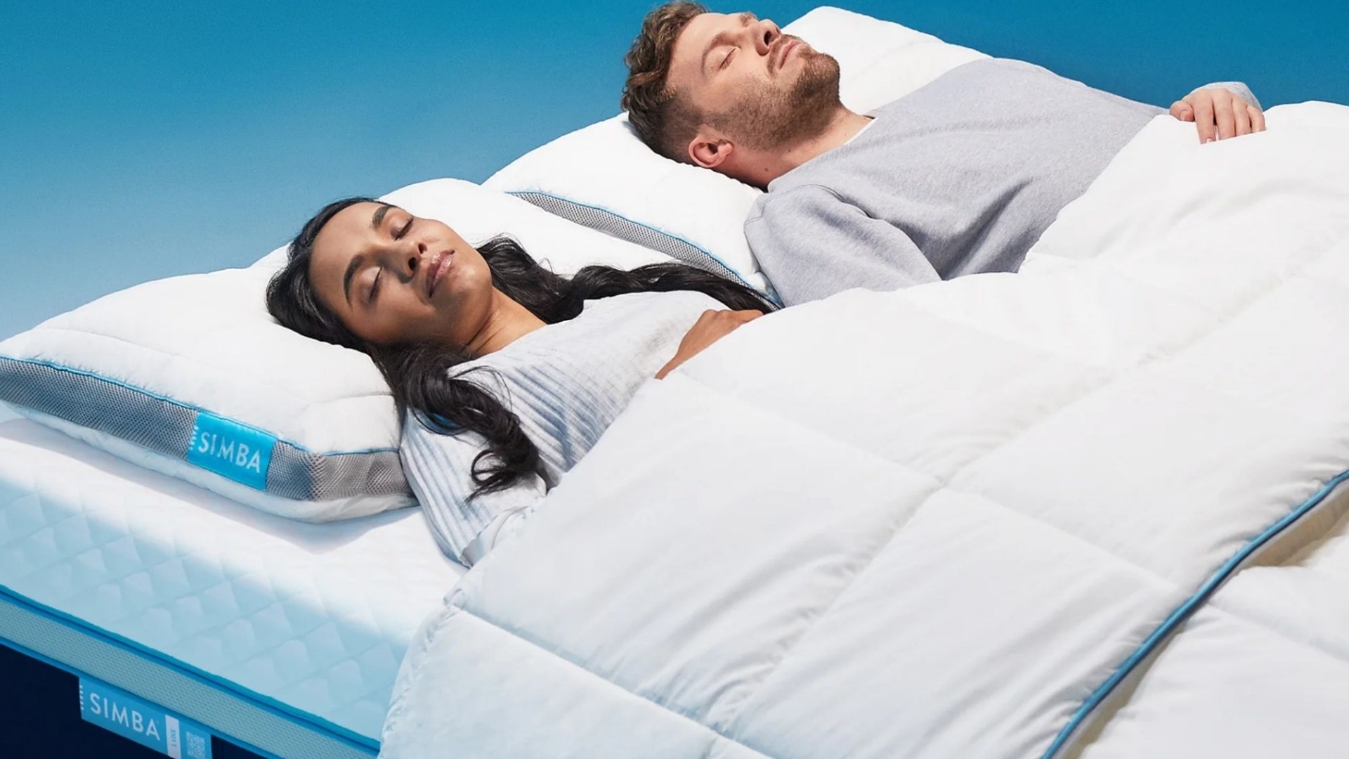 Two people sleeping peacefully on Simba mattresses and pillows.