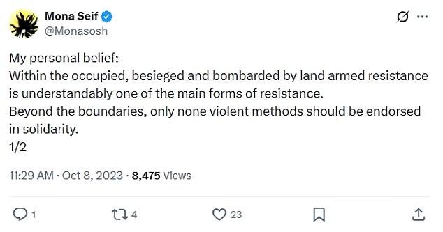 In a further social media post, Ms Seif suggested the 2023 attacks against Israel were ‘understandable’