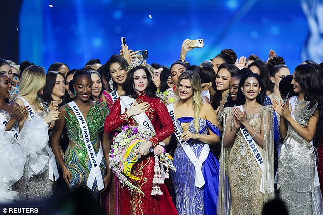 Miss Mexico Fatima Bosch (C) jubilates with fellows after being crowned as Miss Universe 2025 during the 74th Miss Universe 2025