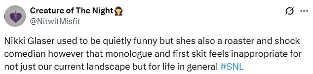 ‘Nikki Glaser used to be quietly funny, but she’s also a roaster and shock comedian; however, that monologue and first skit feels inappropriate for not just our current landscape but for life in general #SNL,’ someone reacted on X.