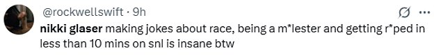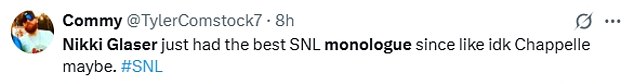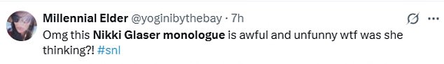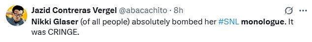 One user added: ‘Nikki Glaser (of all people) absolutely bombed her #SNL monologue. It was CRINGE.’