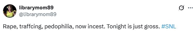 ‘Rape, trafficking, pedophilia, now incest. Tonight is just gross. #SNL,’ someone said.
