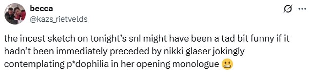 ‘The incest sketch on tonight’s SNL might have been a tad funny if it hadn’t been immediately preceded by Nikki Glaser jokingly contemplating pedophilia in her opening monologue,’ she wrote.