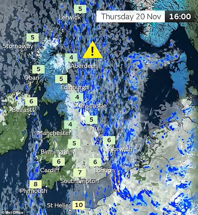 Mr Armstrong said: ‘Temperatures are well below average for the time of year and could get as low as -11C in rural parts of Scotland on Thursday night, with daytime temperatures generally in low single figures for many.