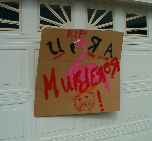 Some of the flamingos escaped, but others, sadly, were never found. After mutual midnight spray-paint tagging attacks on each other’s 3/4-inch plywood hurricane shutters (this was post-Rita/Katrina in 2005), our neighbor woke up to a sign on his garage exposing his cruelty for the whole world to see.