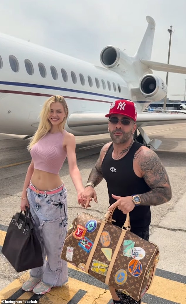 Influencer Sasha Sobhani, whose father Ahmad Sobhani is a former Iranian ambassador to Venezuela, was filmed twirling his 20-year-old girlfriend, Laura Neimas, before the pair boarded the plane.