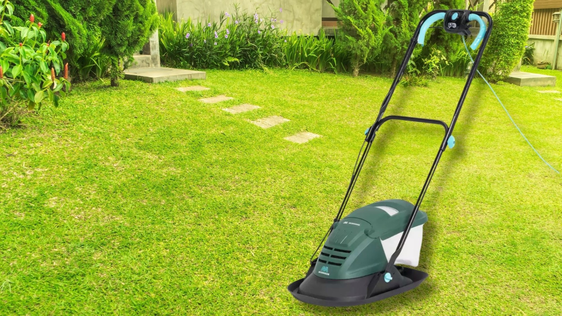 A green lawnmower with a teal handle and cord on a green lawn.
