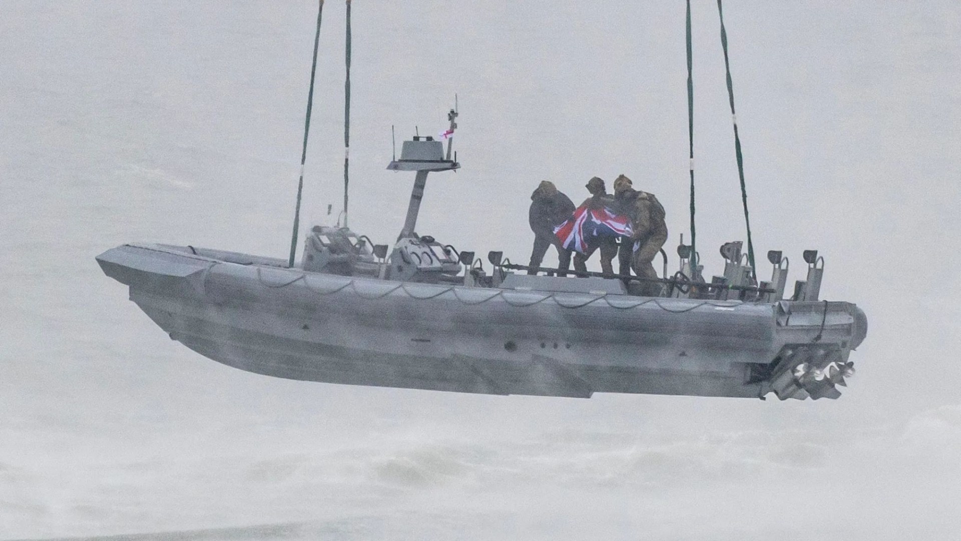 CRACK Special Forces commandos put on a daring show by riding a speedboat slung under a helicopter in the English Channel — and flying the Union Jack.