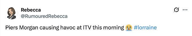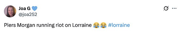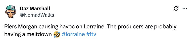 Sharing their thought on X, viewers wrote: ‘Piers Morgan causing havoc on Lorraine. The producers are probably having a meltdown.’