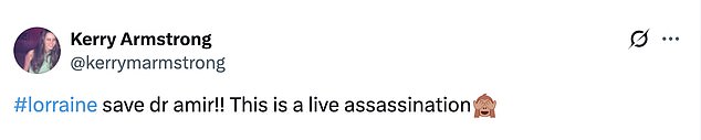 They added: ‘Piers Morgan running riot on Lorraine’; ‘Save Dr Amir!! This is a live assassination’; ‘Piers Morgan causing havoc at ITV this morning’; ‘Lorraine looks very uncomfortable!’