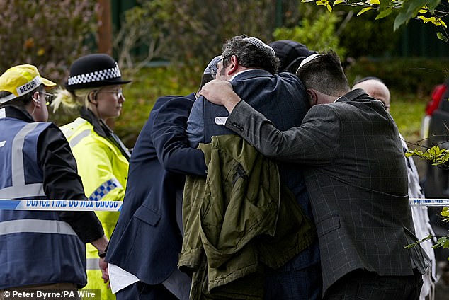 Members of the Jewish community comfort each other outside the Heaton Park Hebrew Congregation synagogue. In the wake of the October terror attack, the government will provide an extra £10million to guarantee the safety of the Jewish community