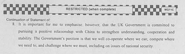 But in the last paragraph of his third and final statement submitted in August this year, just weeks before the case collapsed, he set out the Government’s approach to China.