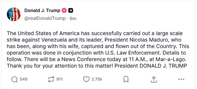 ‘The United States of America has successfully carried out a large scale strike against Venezuela and its leader, President Nicolas Maduro, who has been, along with his wife, captured and flown out of the country,’ Trump said.