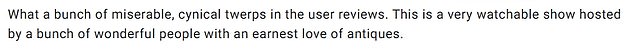 ‘What a bunch of miserable, cynical twerps in the user reviews. This is a very watchable show hosted by a bunch of wonderful people with an earnest love of antiques.’
