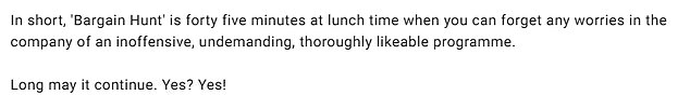 ‘In short, ‘Bargain Hunt’ is forty five minutes at lunch time when you can forget any worries in the company of an inoffensive, undemanding, thoroughly likeable programme.