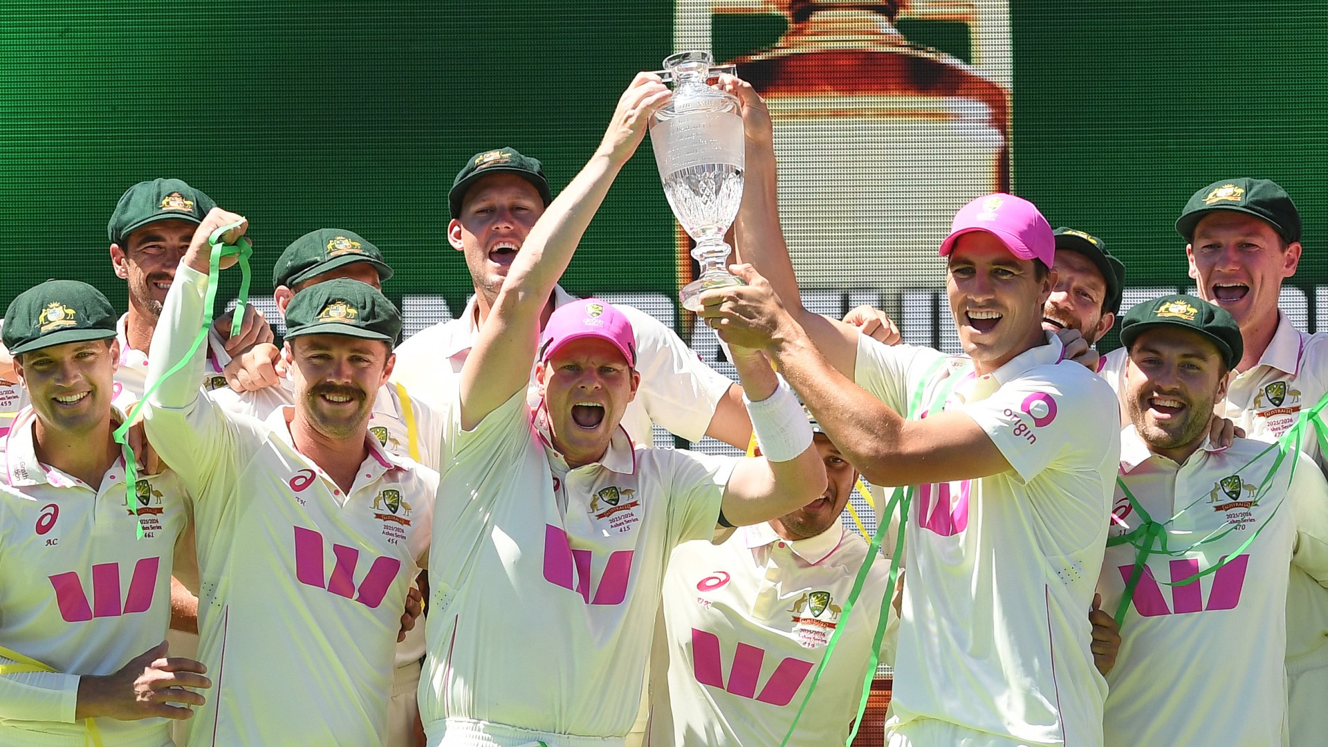 Steve Smith and Pat Cummins hold up The Ashes trophyCredit: Getty
