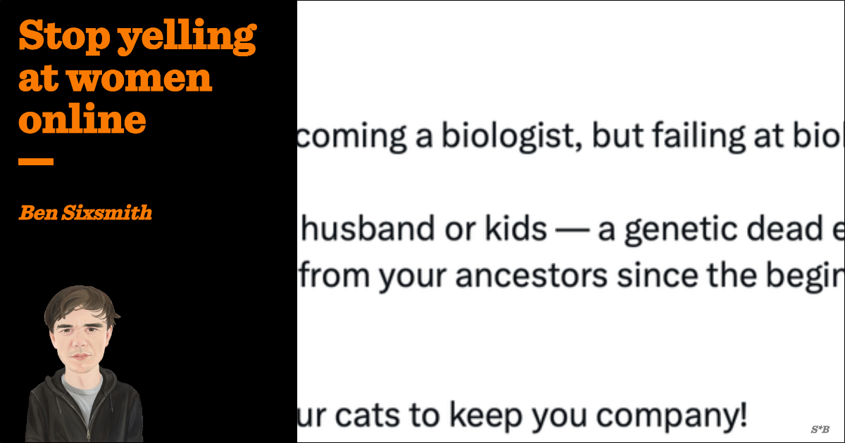 As well as being obnoxious in the obvious ways, they are creating more division between the sexes. Women being told by aggressively humourless and ignorant scolds that there is a kind of zero-sum relationship between marriage and kids on the one hand, and professional and intellectual attainment on the other, might well become more averse to the former path. If an anonymous weirdo tells you that you’re going to be a lonely cat mum if you don’t give up your personal ambitions, after all, you’re hardly likely to say, “I’m sorry @incelrapist1488! Marry me!”