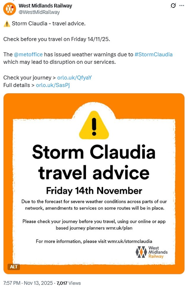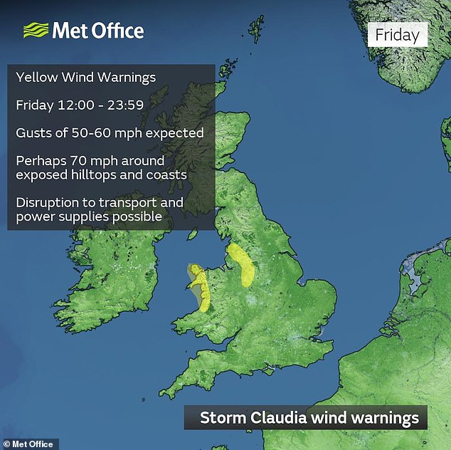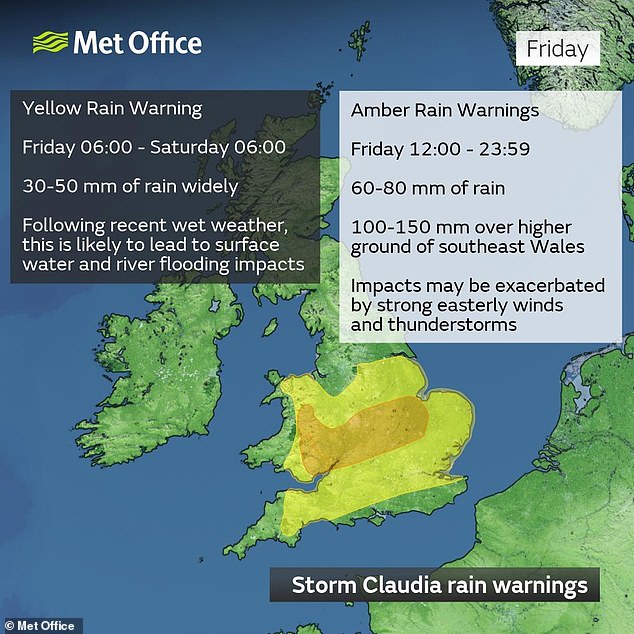Flood duty manager Ben Lukey said: ‘Storm Claudia will bring heavy prolonged rainfall across parts of England, with significant surface water flooding probable across parts of central England on Friday. River flooding impacts are also possible tomorrow and into Saturday.’