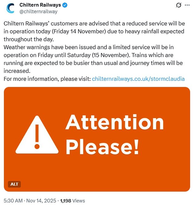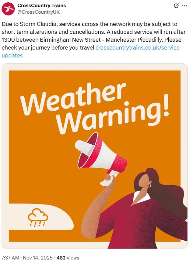 At least seven train operators were running a reduced service due to the weather – Avanti West Coast, Chiltern Railways, CrossCountry, East Midlands Railway, London Northwestern Railway, Northern, TransPennine Express and West Midlands Railway.